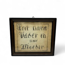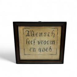 | Omschrijving | Twee 19e eeuwse gravures op papier. Met spreuken in de vorm van mensfiguren.Tekst: "Eert uwer vader en uwe moeder en Mensch leef vroom en goed".Origineel gelijst. |