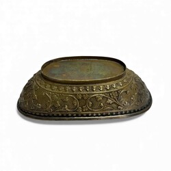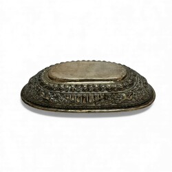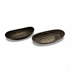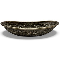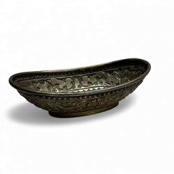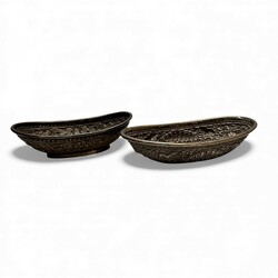 | Omschrijving | Lot van twee antieke Indische offerschaaltjes. Langwerpig model, met gedreven voorstelling, één met bladeren en één met dieren en bloemen. Ongemerkt. |