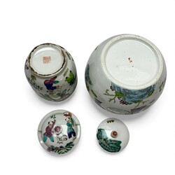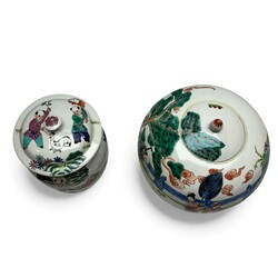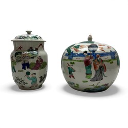 | Omschrijving | Lot van twee 20e eeuwse Chinees porseleinen dekselpotten, beide met Famille Rose decor van figuren in een landschap. Eén gemerkt met zegelmerk. |