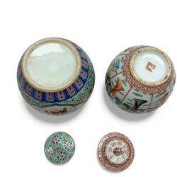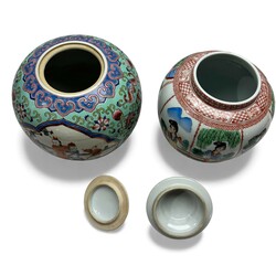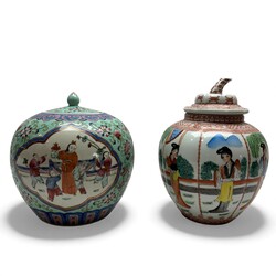 | Omschrijving | Lot van twee 20e eeuwse Chinees porseleinen dekselpotten, beide met Famille Rose decor, één met decor van lijzen in medaillons. |
