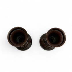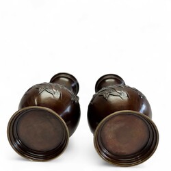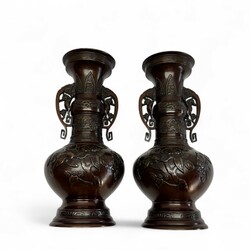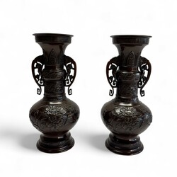 | Omschrijving | Een stel antieke gepatineerd bronzen vazen, gedecoreerd met reliëfdecor van bloemen en vogels op de buik en banddecoraties met wolken- en dierenmotieven, de grepen vormgegeven als dierfiguren. Ongemerkt, Japan, Meiji periode (1868-1912). |