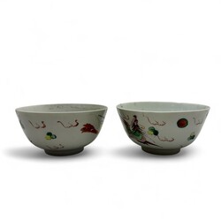 | Omschrijving | Lot van twee 19e of 20e eeuwse Chinees porseleinen kommen, met decor van fenix en draak die op parel jaagt. Ongemerkt. |