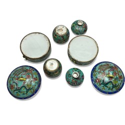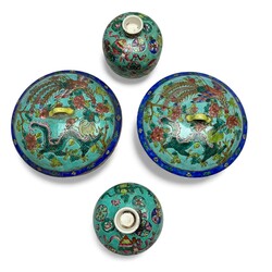 | Omschrijving | Lot van twee paar 20e eeuwse Chinees porseleinen dekseldozen, allen met turqoise beschildering. Kleine dekseldozen met voorstelling van kostbaarheden en twee vissen, grote dekseldozen met draken en feniks. |