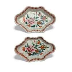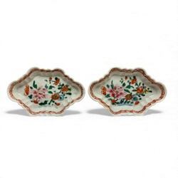 | Omschrijving | Twee 18e eeuwse Chinees porseleinen Famille Verte schuitvormige patti bakjes. Met servet werk om de rand en een floraal decor op het plat. Qianlong periode |