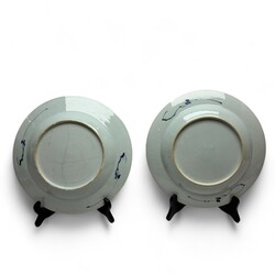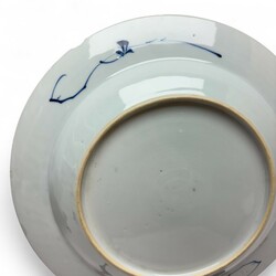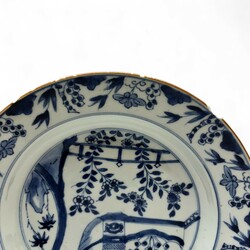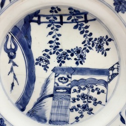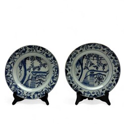 | Omschrijving | Twee Chinees porseleinen Qianlong periode schotels. Blauw/wit met een decor van een bloemen en bamboe op de rand en een decor van een Chinese tuin op het plat, ca 1760 |