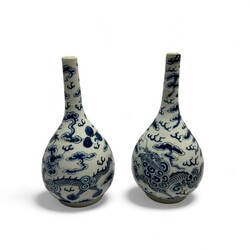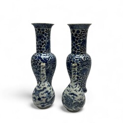 | Omschrijving | Twee Chinees porseleinen puntflessen, blauw/wit met rondom een draken decor. Hierbij twee Chinees porseleinen bekervazen, blauw/wit met een decor van twee draken tussen de pioenrozen en bladeren. 19e eeuws KangXi revival. |