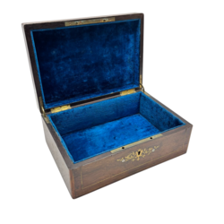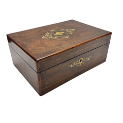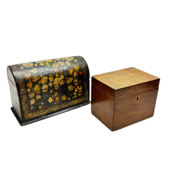 | Omschrijving | Lot van drie houten kistjes, waarvan één met messing ingelegd. Hierbij een beschilderd papier maché exemplaar. |