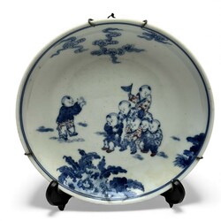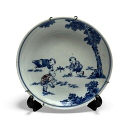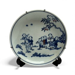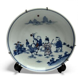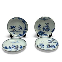 | Omschrijving | Lot van vier 20e eeuwse Chinees porseleinen bordjes, blauw-wit decor met voorstelling van spelende jongetjes. Aan de achterzijde met apocrief Kangxi merk in dubbele ring. |