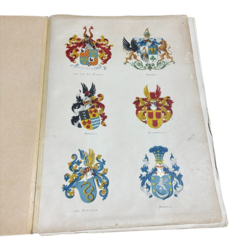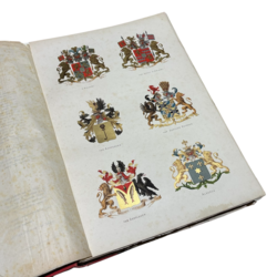 | Omschrijving | Antiek boek, Wapenboek van den Nederlandschen Adel, Rietslap, gevuld met afbeeldingen van familiewapens. Betreft het eerste deel, zonder titelpagina. Met daarbij een handbeschilderde afbeelding van het familiewapen Buwalda en een boek met losse familiewapens. |