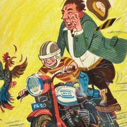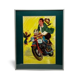 | Omschrijving | Krijttekening op papier, voorstelling van een jongetje op een motor, met oudere man als bijrijder. Rechtsonder gesigneerd Will Berg (Arnhem 1921-2001). Betreft het originele ontwerp voor de omslag het boek ‘Wat Jantje droomde’. |
