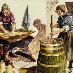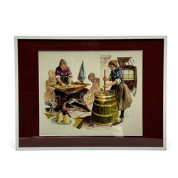 | Omschrijving | Gouache op papier, voorstelling van twee vrouwen met melkaad en karnton. Rechtsonder gesigneerd Will Berg (Arnhem 1921-2001). Betreft een originele illustratie voor het kindertijdschrift ‘Taptoe’. |
