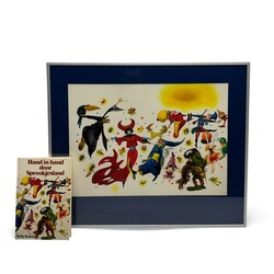 | Omschrijving | Gouache op papier, voorstelling van diverse sprookjesfiguren. Betreft het originele ontwerp voor de boekomslag van het boek ‘Hand in hand door sprookjesland’ van Nelly Kunst. Rechtsonder gesigneerd Will Berg (Arnhem 1921 - 2001). Met daarbij het boek. |