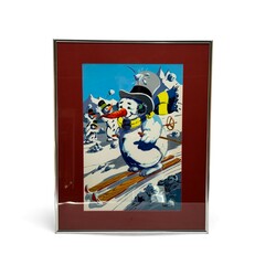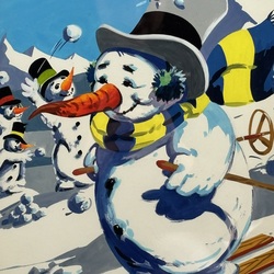 | Omschrijving | Gouache op papier, voorstelling van een sneeuwpop op ski’s, bekogeld door andere sneeuwpoppen. Rechtsonder gesigneerd Will Berg (Arnhem 1921-2001). Betreft een originele illustratie voor het kindertijdschrift ‘Okki’. |
