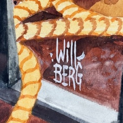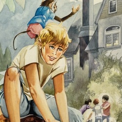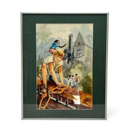 | Omschrijving | Gouache op papier, voorstelling van een jongen met aap op een dak met touw. Origineel ontwerp voor de omslag van het boek ‘Robert Jan en het geheim van Berg en Dal’. Linksonder gesigneerd Will Berg (Arnhem 1921 - 2001). Met daarbij het originele boek. |