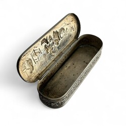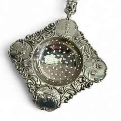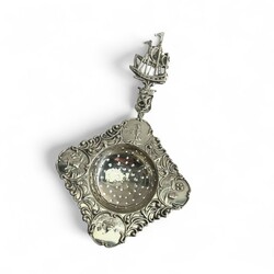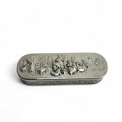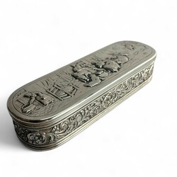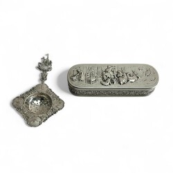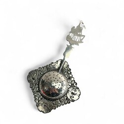 | Omschrijving | Een 20e eeuwse tweede gehalte (835/1000) zilveren lepeldoos, ovaal model, met voorstelling van een interieur aan de bovenzijde. Gemerkt aan de onderzijde met lopende leeuw en meesterteken Z/Z = Zaanlandse Zilversmederij, Haarlem, jaarletter M (1947). Met daarbij een zilveren theezeefje, bekroond met driemaster en landschappen in medaillons, mr. WB. |