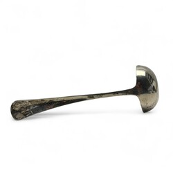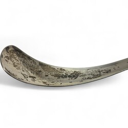 | Omschrijving | Een 20e eeuwse tweede gehalte (835/1000) zilveren soeplepel, model Haags Lof. Gemerkt met lopende leeuw, minervakopje, meesterteken V = zilverfabriek Voorschoten, jaarletter P (1925), tevens gegraveerd met initialen ‘A.J.K’ en datering 14-2-26. |