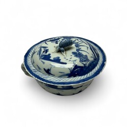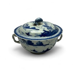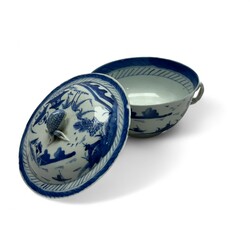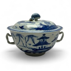 | Omschrijving | Een antieke laat 18e of vroeg 19e eeuwse Chinees porseleinen dekselkom met twee grepen, met onderglazuur blauw decor van tempels in landschappen. |