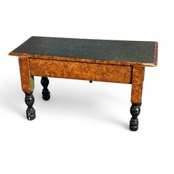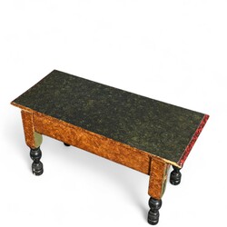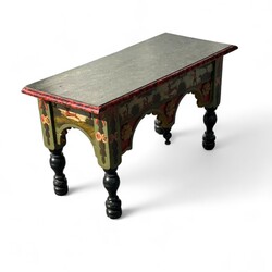 | Omschrijving | Een 20e eeuws volkskunst bedsteebankje, gestoken, gedraaide poten en beschilderd met jachtdecor |