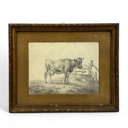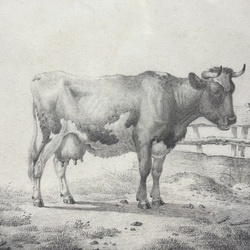 | Omschrijving | Albertus Verhoesen (1806-1881), koe in de weide, potloodtekening, rechts in het midden gesigneerd bij het hek |