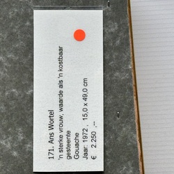 | Omschrijving | Ans Wortel (1929-1996), ‘N sterke vrouw waarde als ‘n kostbaar gesteente’, gouache op papier, rechtsboven gesigneerd en gedateerd ‘72 |