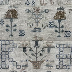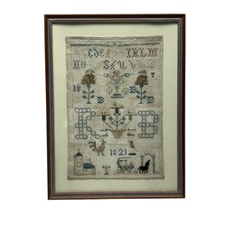 | Omschrijving | Antieke merklap, van boven naar beneden: geborduurd alfabet, goudsbloemen en bloemenvaas, de initialen ‘RB’ en datering ‘1821’, met onderaan een kerkje en paard-en-wagen |