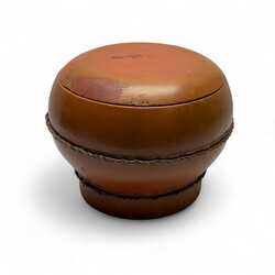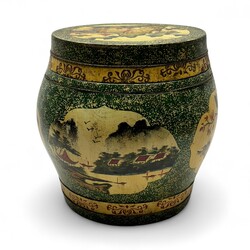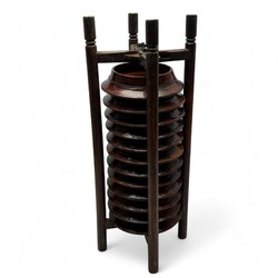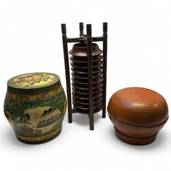| Omschrijving | Drie Chinese objecten: draagbaar houten bordenrek met twaalf borden, roodgelakte ronde voedseldoos, en polychroom beschilderde voorraadton met landschaps- en bloemdecor in cartouches |