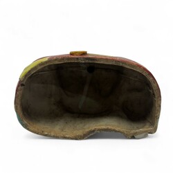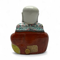 | Omschrijving | Chinees porseleinen boeddha, blank geglazuurd met het gewaad in vele kleuren, verso met restanten van sticker en lakzegel, 19e eeuw |