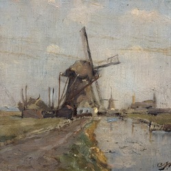| Omschrijving | Schilderij, olieverf op doek, gemonteerd op board (marouflé). Polderlandschap met molens op zomerse dag. Rechtsonder gesigneerd Cornelis Jan Mension (Delft 1882-1950) |
