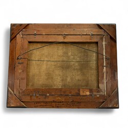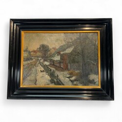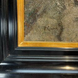 | Omschrijving | Duitse School: dorpsgezicht, olieverf op doek, gesigneerd P. Groot, 20e eeuw, in kapitale zwarte lijst met goudkleurige bies |