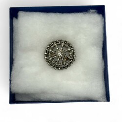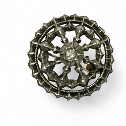| Kavel | 677. Een antieke eerste gehalte zilveren doekspeld met roosgeslepen diamant. Met 14 krt gouden speld. |