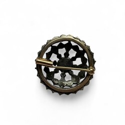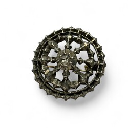 | Omschrijving | Een antieke eerste gehalte (925/1000) zilveren doekspeld met roosgeslepen diamant. Met 14 krt (585/1000) gouden speld. |