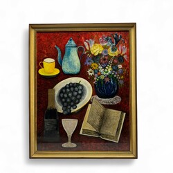 | Omschrijving | Europese School: kleurrijke voorstelling met bloemenvaas, wijnfles en koffiepot, acrylverf op papier met goudkleurige details, onduidelijk gesigneerd rechtsonder [Kotarba?] -onderzoek- |
