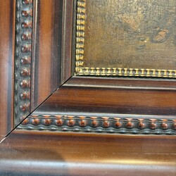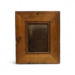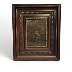 | Omschrijving | Europese School: man zittend op een stoel, met achter hem een uil op een hekje, olieverf op paneel, linksonder gesigneerd |