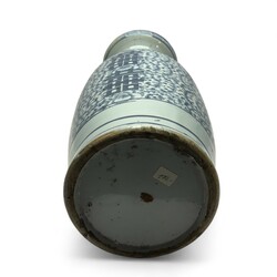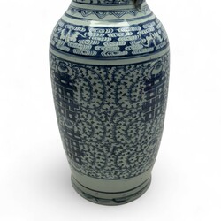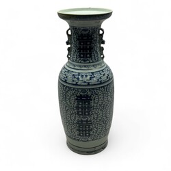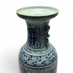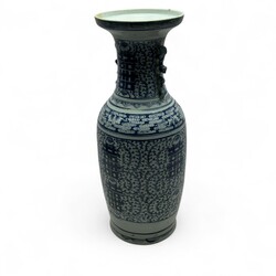 | Omschrijving | Grote Chinees porseleinen vaas met blauw-wit floraal decor en karakters, aan weerszijden van de hals diervormig greepjes, 19e eeuw |