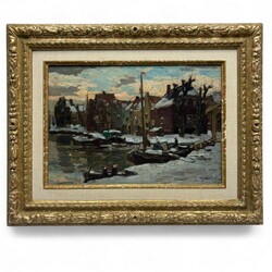 | Omschrijving | Schilderij, olieverf op paneel. Winterlandschap met schepen in een haven. Rechtsonder gesigneerd Henk van Leeuwen (Ter Aar 1890 – Voorburg 1972) |
