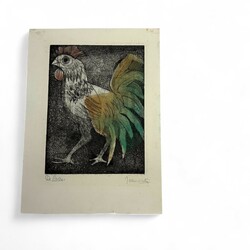 | Omschrijving | Lot van twee kunstwerken: een ets (aquatint) op papier, 'de haan'. Rechtsonder gesigneerd Jeanne Bieruma Oosting (Leeuwarden 1898 - Almen 1994). En een kleurenets, 'Sprinkhaan', tevens gesigneerd Bieruma Oosting. Herkomst: galerie de Krijtkring, Hoorn. |