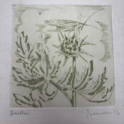 | Afmetingen | 15,5 x 12, papiermaat 22,5 x 16,5 cm. Sprinkhaan 13 x 13 cm, 33 x 26,5 cm |
