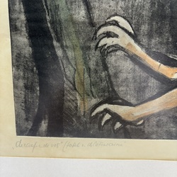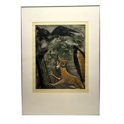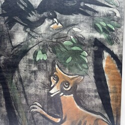 | Omschrijving | Ets (aquatint) op papier. 'De raaf en de vos (Fables de la Fontaine)'. Rechtsonder gesigneerd Jeanne Bieruma Oosting (Leeuwarden 1898 - Almen 1994). Herkomst: galerie de Krijtkring, Hoorn. |