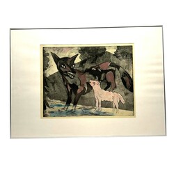 | Omschrijving | Ets (aquatint) op papier. 'Het geitje en de wolf'. Gemonogrammeerd (in de druk) 'J.O.' = Jeanne Bieruma Oosting (Leeuwarden 1898 - Almen 1994). Herkomst: galerie de Krijtkring, Hoorn. |