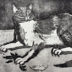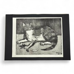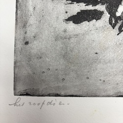 | Omschrijving | Ets (aquatint) op papier. Voorstelling van een kat, titel 'Het roofdier'. Rechtsonder gesigneerd Jeanne Bieruma Oosting (Leeuwarden 1898 - Almen 1994). Herkomst: galerie de Krijtkring, Hoorn. |