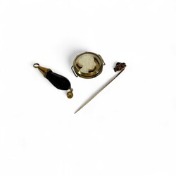 | Omschrijving | Een lot met 14 krt (585/1000) gouden sieraden. Bestaande uit een dasspeld en een hanger beide met granaat en een horlogekast met medallion. |