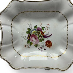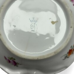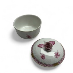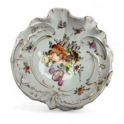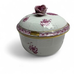| Omschrijving | Lot porselein: porseleinen dekselpot, ronde kom, en ovaal schaaltje, decor ‘Apponyi pink’, gemerkt en uitvoering Herend, Hongarije, 20e eeuw, daarbij: witgeglazuurd aardewerk serveerschaal met bloemdecor en vergulde details, en porseleinen rocaille vormig schaaltje, gemerkt met bekroonde D, vermoedelijk Dresden, circa 1900 |