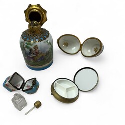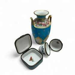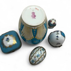 | Omschrijving | Lot porselein met decoraties in lichtblauw en vergulde details: sierschotel, oorvaasje, antiek parfumflesje met romantisch decor en verguld metalen monturen, vermoedelijk Frankrijk, eind 19e eeuw, en vijf snuisterijen- of pillendoosjes, waaronder eivormig exemplaar, gemerkt en uitvoering Limoges, Frankrijk |