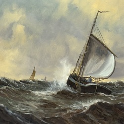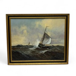 | Omschrijving | Schilderij olieverf op doek, 40 x 50 cm. Schepen op woeste zee. Gesigneerd P. Moerman. 20e eeuws |