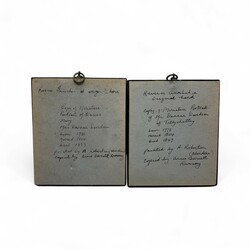 | Omschrijving | Paar 19e-eeuwse Engelse portretminiaturen van het echtpaar ‘Mr. and Mrs. Duncan Davidson’, verso met opschrift ‘Painted by A. Robertson (Aberdeen), copied by Annie Barnett Ramsay’, aquarel op papier, in gezwarte lijstjes met messing monturen |