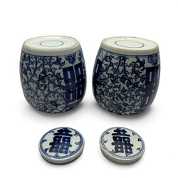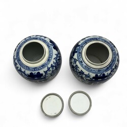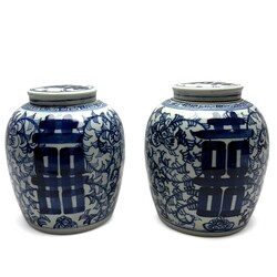 | Omschrijving | Paar grote Chinees porseleinen gemberpotten met blauw-wit decor: karakters waaromheen florale motieven, begin 20e eeuw |