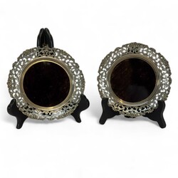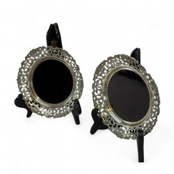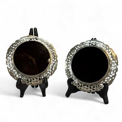 | Omschrijving | Paar tweede gehalte zilveren flessenbakken met opengewerkte rand met floraal decor, blad van bruin kunststof |