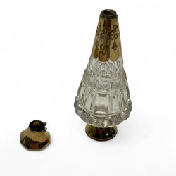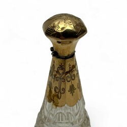 | Omschrijving | Geslepen kristallen peervormige parfumflacon met 14 karaats gouden dop en voet, het goud met gegraveerde florale motieven |
