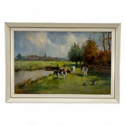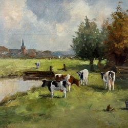 | Omschrijving | Schilderij, olieverf op paneel. Fries landschap met koeien en kerkdorp op de achtergrond. Rechtsonder gesigneerd Tjerk Wielinga (Sneek 1901 - Hilversum 1957). |