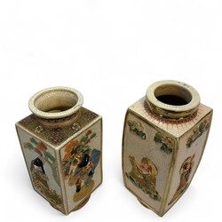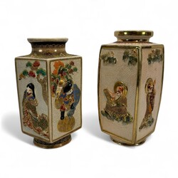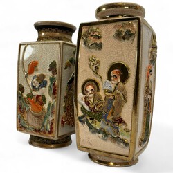 | Omschrijving | Twee Satsuma aardewerk vazen met polychroom figurendecor en vergulde details, 20e eeuw |